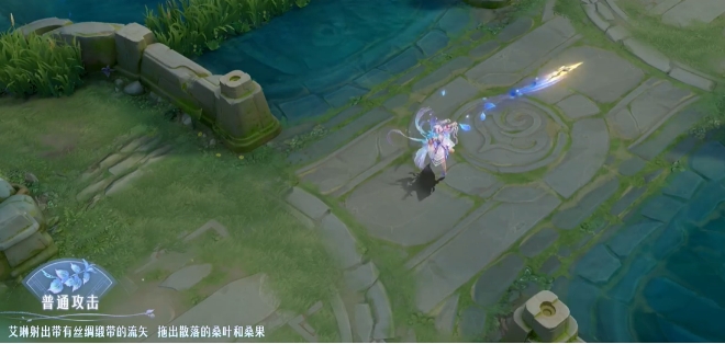 1、普通攻击:艾琳射出带有丝绸缎带的流矢,拖出散落的桑叶和桑果。