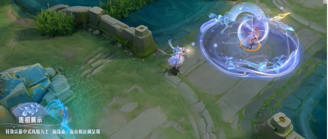 4、二技能特效:蚕丝化为丝绸环绕其身,扇形框景印记显现,地面四周蚕丝蜿蜒成环,将美好织进身边。