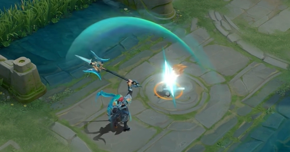 1、普攻:吕布挥舞方天画戟,攻击时附带青绿色特效。