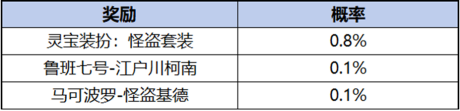 1、活动奖励:鲁班七号-江户川柯南,马可波罗-怪盗基德,灵宝装扮:怪盗套装,积分夺宝抵用券,皮肤碎片,亲密度道具魔术表演,亲密度道具侦探模式。