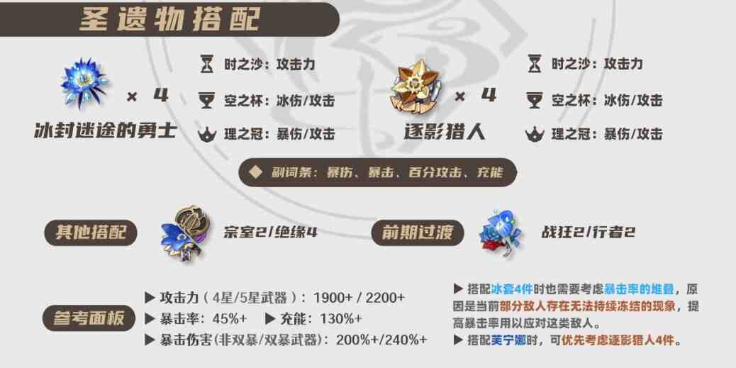 搭配冰套4件时也需要考虑暴击率的堆叠,原因是当前部分敌人存在无法持续冻结的现象,提高暴击率用以应对这类敌人。