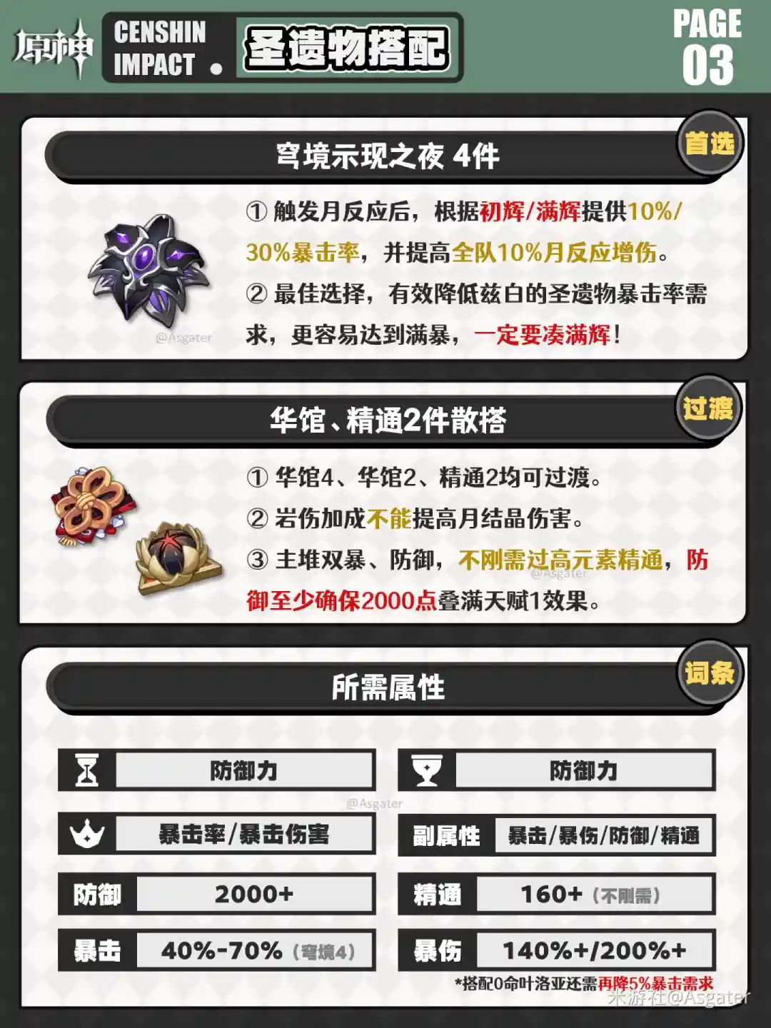 ●词条固定防御沙、防御杯、双暴头,优先满足2000点防御阈值,拉满天赋的月结晶反应基础伤害加成,这点还是很容易达成的,其次堆叠双暴、精通,充能约130%左右即可轻松循环;