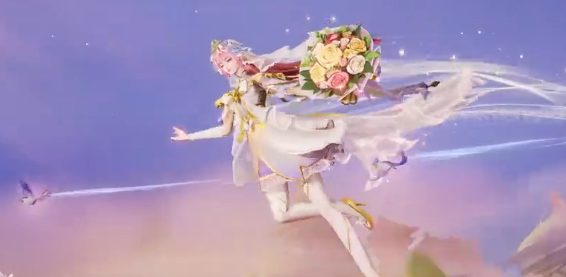 【大乔-沐霞之诺星传说】整体以白金为底色,层叠设计的短款婚纱,梦幻优雅。粉色披肩长发,搭配镂空皇冠与轻盈头纱,气质温柔。缀以金色荆棘与水晶蕾丝,突显华美格调。武器化作手中三色交织的捧花,与霞光交相映衬。