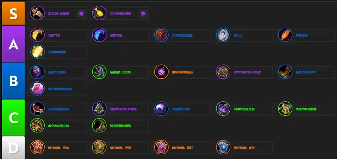 敏锐贼优先选择能够在关键技能冷却期间提升伤害输出的饰品。这通常意味着持续90秒或120秒的饰品,增加精通或急速,同时搭配一个被动饰品选项。本赛季最强的主动饰品是 圣光连队的旌旗。而 烬翼羽毛 和 艾杰斯亚谜题盒 则是可以通过大秘境副本获取的可替代饰品。