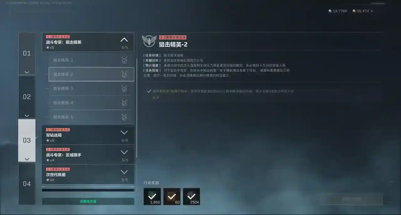 1、任务目标:在任意机密/绝密行动中,使用任意配备6倍及以上倍率瞄准镜的枪械,累计击败3名敌方特战干员。